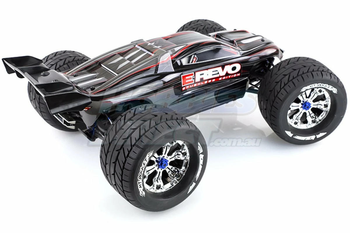 If you’re wanting to install these to your brushed Traxxas E-Maxx please keep in mind you’ll require the Traxxas red 17mm wheel hex adapters or blue 17mm wheel hex adapters for proper installation.